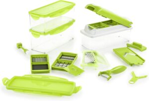 Der Genius Nicer Dicer Plus ist der ultimative Helfer, wenn es um schnelles und gleichmäßiges Schneiden von Obst und Gemüse geht. Mit diesem manuellen Küchenhelfer sparst du nicht nur wertvolle Zeit bei der Vorbereitung, sondern erzielst auch professionell aussehende Ergebnisse. Das Set umfasst verschiedene Einsätze für Würfel, Stifte, Scheiben und Streifen in unterschiedlichen Größen – so ist für jedes Rezept die passende Schneidvariante dabei.