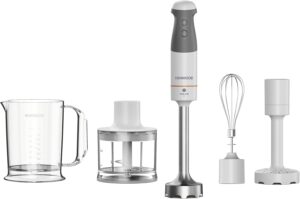 Das Kenwood Triblade Stabmixer Set ist ein vielseitiger Küchenhelfer, der gleich mehrere Geräte in einem vereint. Das Herzstück bildet der leistungsstarke 850-Watt-Motor, der selbst härtere Zutaten problemlos zerkleinert. Die innovative Triblade-Technologie mit drei versetzt angeordneten Klingen sorgt für besonders effizientes Mixen und verhindert Spritzer – ein großer Vorteil gegenüber herkömmlichen Stabmixern.
