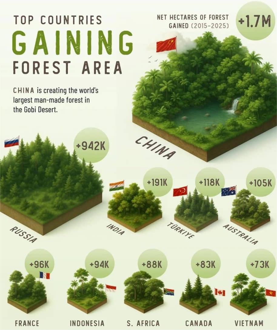 Seit den 1970er Jahren verfolgt China mit der „Großen Grünen Mauer“ ein einzigartiges, teils kontroverses Programm: Millionen Hektar wurden gegen die Ausdehnung der Wüste Gobi und Taklamakan aufgeforstet. Zwischen 2015 und 2025 legte das Land laut FAO um netto 1,7 Mio. Hektar zu – Weltrekord! Trotz lokaler Probleme mit der Überlebensrate der Setzlinge wird das Projekt bis 2050 weiter ausgebaut.